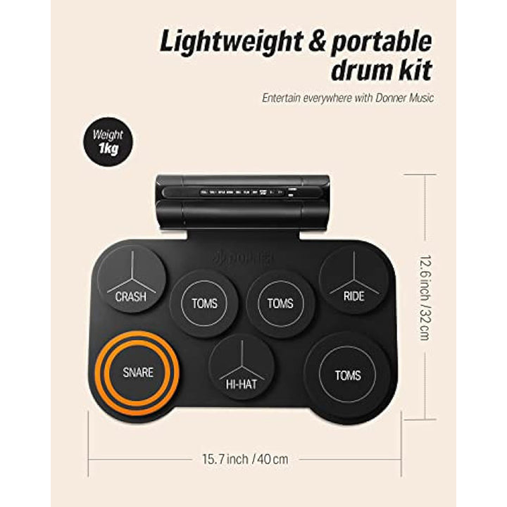 - [Quiet, No Worry From Noise] Donner electronic drum pad is made of high-quality soft silicone, which can reduce the noise when drumming. It supports a 3.5mm headphone output, you can wear a set of headphones to improve your technique without disturbing your family, roommates, or neighbors. It is so easy to store that you can roll it up, and pack it in your bag.